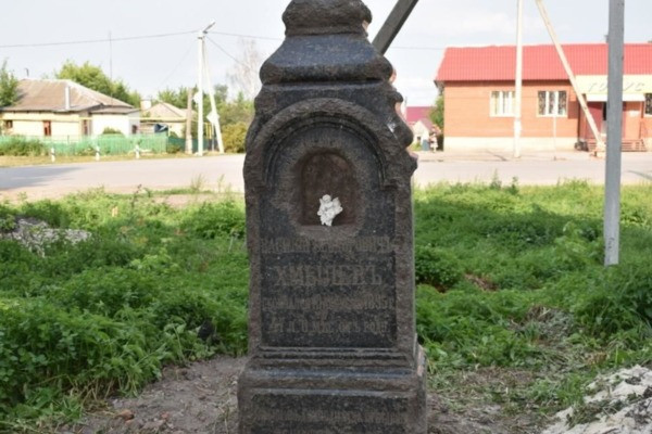 Во время раскопок у церкви нашли памятник из черного мрамора. На нем высечены имена Хмылевых Василия Федоровича и Натальи Степановны и даты их жизни и смерти.