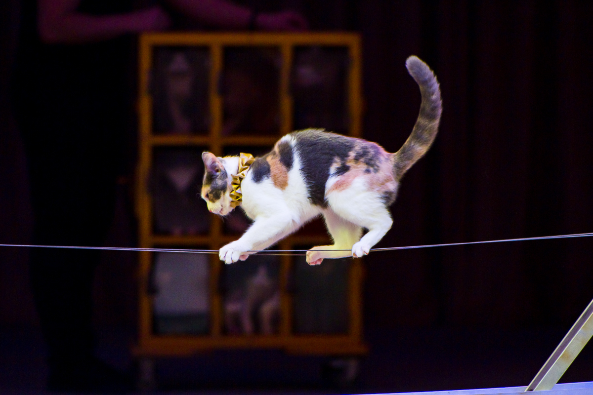 На протяжение всего выступления на манеж выходили дрессированные коты и собаки. Коты по очереди выполняли трюки, прыгали с большой высоты, крутили лапами мяч и даже выезжали на сцену на детской электрической машине.