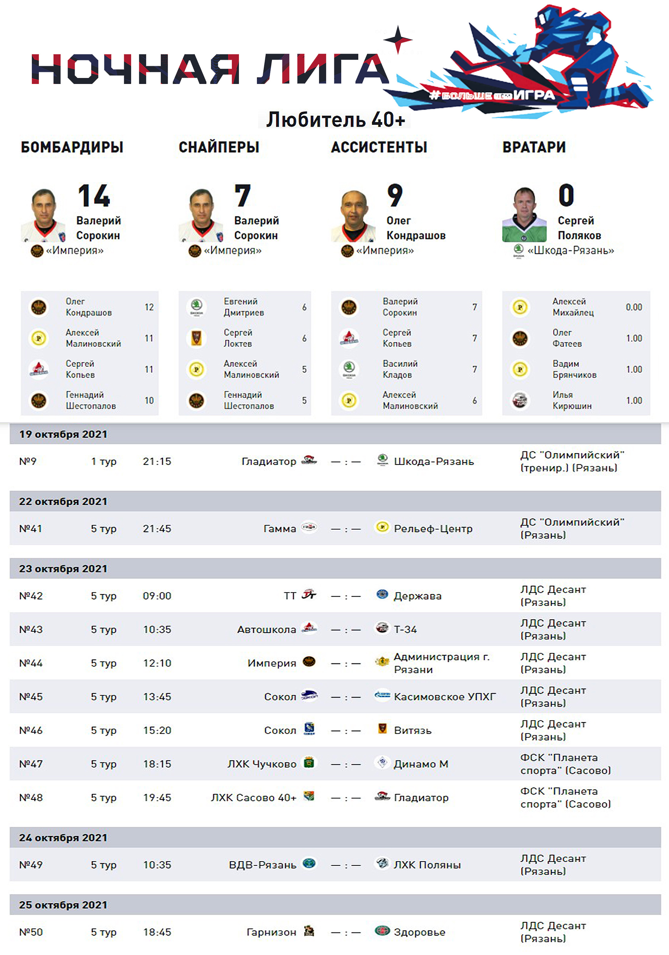 «Уже в 2012-м мы установили рекорд по количеству команд в дивизионе «40+", — рассказал региональный представитель Ночной лиги в Рязанской области, депутат рязанской городской думы, хоккеист-любитель Олег Смирнов. — Ни в одном регионе не было так много участников. Теперь у нас три дивизиона: «18+", «40+" и «50+". К тому же турнир для игроков старшего возраста в Рязанской области появился раньше, чем в других регионах. В прошлом году в апреле прошел экспериментальный розыгрыш: матчи шли в течение месяца, и уже в этом сезоне у нас стартовал полноценный дивизион для категории «50+".