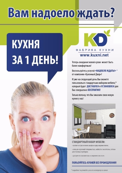 Мебельная фабрика «Кухонный двор» вышла на рынок с эксклюзивным предложением «Надоело ждать». Эта услуга позволяет сделать ожидание ультрамодной высококачественной кухни более комфортным. Если оформить заказ на приобретение новой мебели в «Кухонном дворе», то уже на следующий день можно воспользоваться стандартным кухонным гарнитуром, который будет доставлен и установлен бесплатно. Комплект мебели доступен в классическом и современном стиле, состоит из трех нижних шкафов и двух верхних полок, оснащен варочной поверхностью, мойкой, смесителем и лотком для столовых приборов.