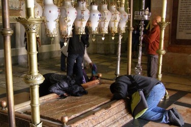 Напротив входа любой паломник видит длинный плоский камень, на котором люди часто бьют земные поклоны. Согласно легенде, это тот самый камень, на котором происходило обмывание тела Христа. Далее можно пройти влево — в ротонду Воскресения, а можно вправо — к Голгофе.