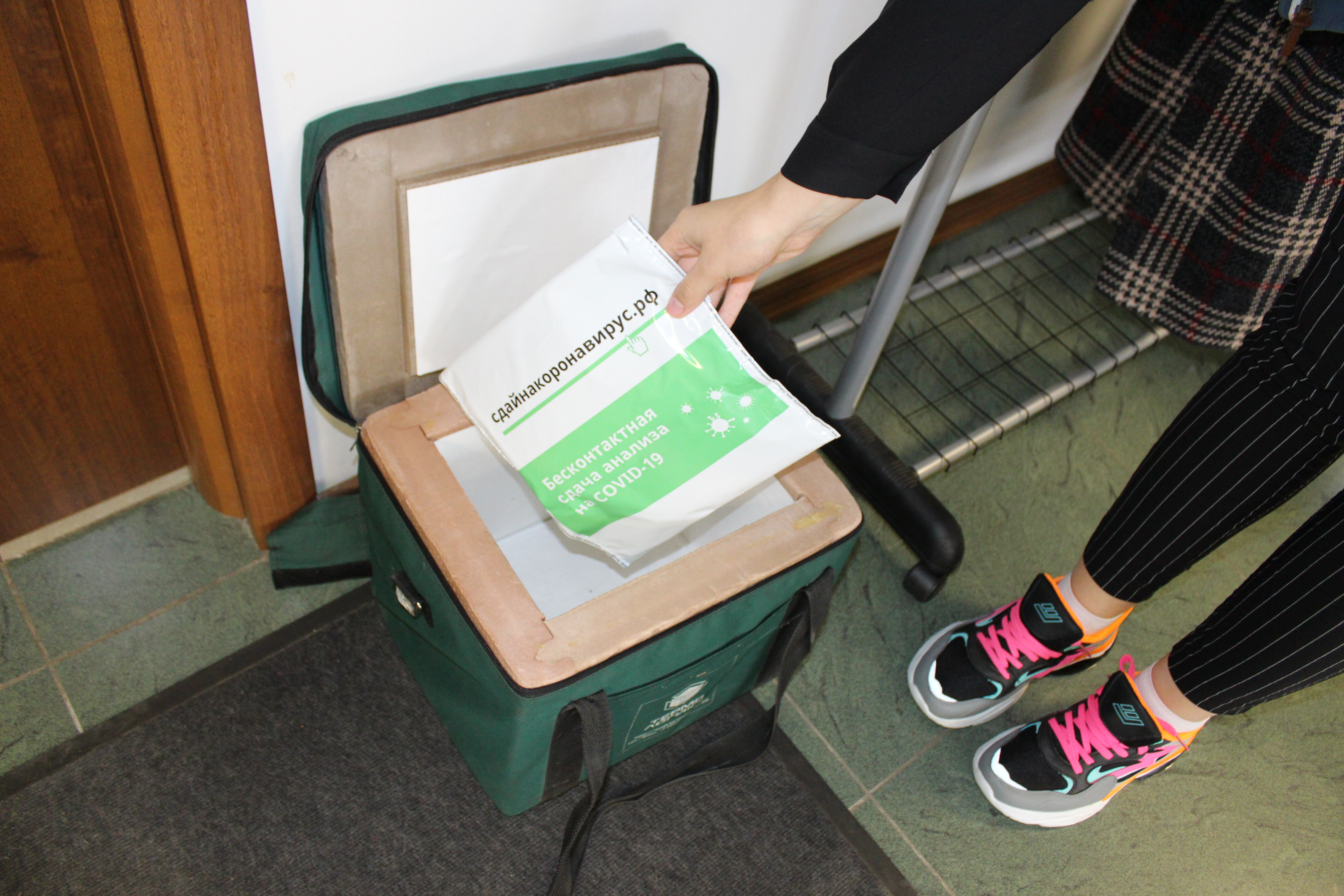 В назначенный день позвонил курьер, он предупредил о своем визите. Сотрудник приехал вовремя в маске и перчатках. Поставив сумку-холодильник с запечатанным пакетом для анализов в редакции, курьер остался ждать за дверью.