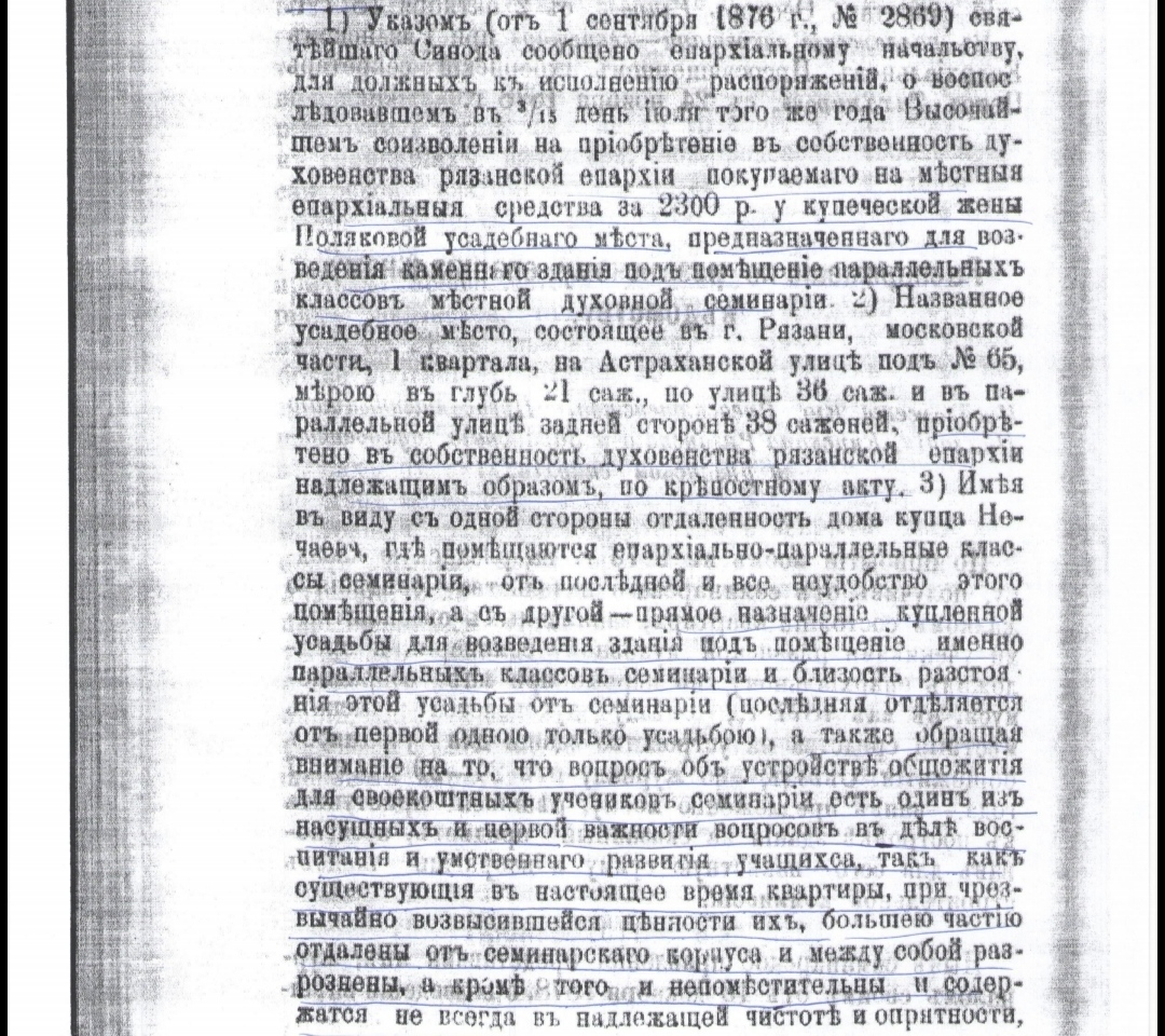 И вот сейчас настала очередь школы № 6, где в царское время также были классы семинарии и общежитие для ее учеников. В качестве доказательства этого факта церковь предъявила справку из областного архива, в которой сказано, что 1 сентября 1876 года Рязанскому епархиальному начальству было дано «соизволение на приобретение в собственность духовенства, покупаемого на местные епархиальные средства за 2300 рублей у купеческой жены Поляковой, усадебного места, предназначенного для возведения каменного здания под помещение параллельных классов местной духовной семинарии». Также было решено построить здесь комнаты для своекоштных, то есть живущих на свои средства, учеников.