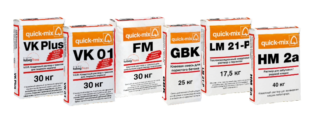 - кладочные растворы quick-mix тщательнейшим образом подобраны по степени водопоглощения кирпича и разделены на четыре виды. Благодаря этому, в кладочном растворе всегда будет оставаться необходимое количество воды, необходимой для набора заявленной прочности, независимо от степени водопоглощения кирпича. Кирпич не будет излишне впитывать воду из раствора, позволяя ему набирать прочность в оптимальных условиях. Это обеспечивает максимальную степень сцепления кладочного раствора и кирпича. Достигаются максимальные характеристики по плотности и прочности кладочного раствора, повышающие срок службы кладки в целом.