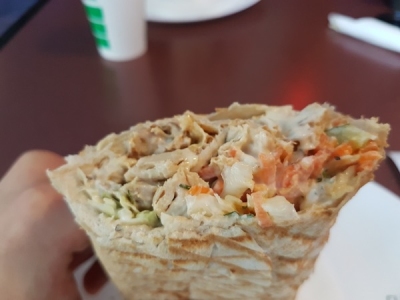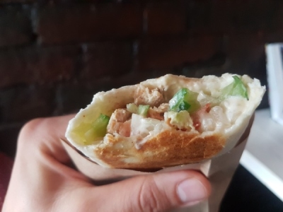 Первое впечатление самое важное. Так вот, в самом начале своего обеда я вообще не почувствовал вкус курицы: ни ароматного маринада, ни специй. Было ощущение, что в блюде отварная куриная грудка. Возможно, вкус перебивали соус и остальные овощи: капуста, укроп, огурец и помидор.