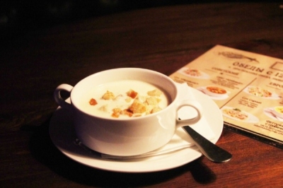 Форшмак оказался приятным на вкус и не горчил, но гренки из черного хлеба были чересчур масленые. После закуски суп пришлось подождать несколько минут.