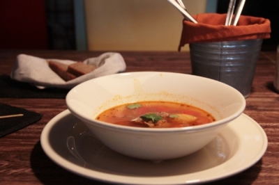 Я все-таки решил подождать салат и получил его спустя две минуты после горячего. Он выглядел очень аппетитно, а самое главное — только приготовленным. Вместе с фасолью в тарелке оказалась курица, листья салата, стручковая фасоль и помидоры под соевым соусом. «Фишкой» блюда стала теплая картошка, которая, на мой взгляд, идеально сочеталась с остальными ингредиентами. Салат оказался настолько вкусным, что я не успел заметить, как моя тарелка оказалась пустой. Благо, к этому времени принесли суп, но так и не принесли салфетки.