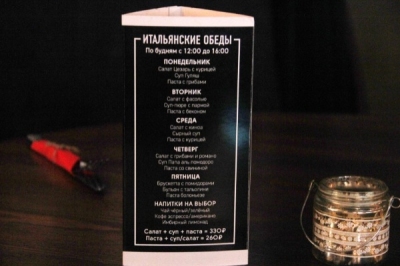 Все столики в заведении были сервированы на максимальное количество гостей. Официантка принесла мне основное меню и забрала лишнюю посуду со стола. Меню бизнес-ланча уже находилось на столике. Блюда для него подбираются в соответствии с днем недели.