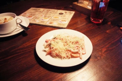 Во вторник мне пришлось заказать салат с фасолью, суп-пюре с пармой (ветчиной, не футбольным клубом) и пасту с ветчиной (карбонару) за 330 рублей, за 260 можно было ограничиться двумя блюдами. В подарок я еще получил бесплатный напиток. Выбор пал на имбирный лимонад.