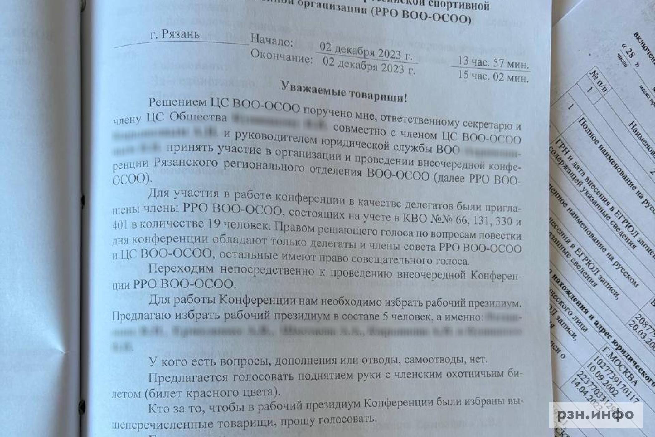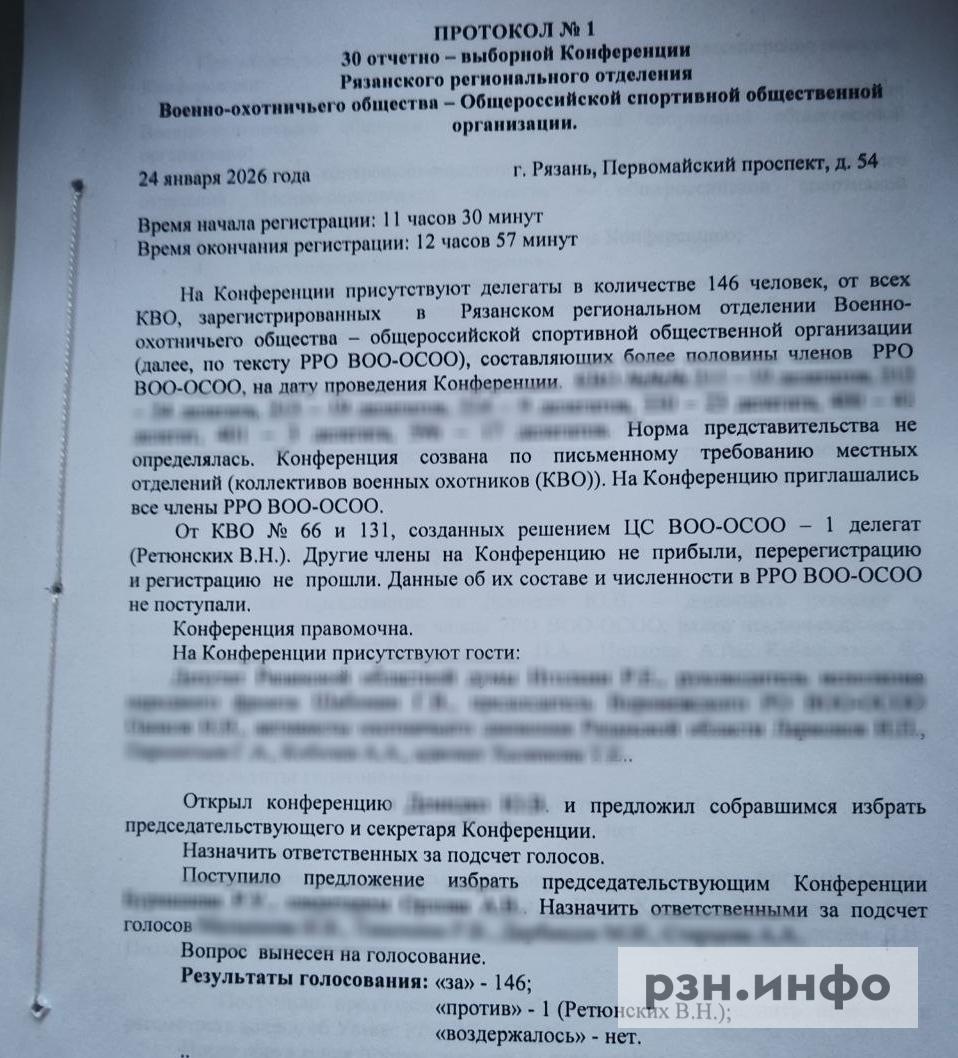 Отмечается, что из ЦС в Рязань никто не приехал, а от «прошедших перерегистрацию» прибыл только Вячеслав Ретюнских. Всего собралось 146 охотников.
