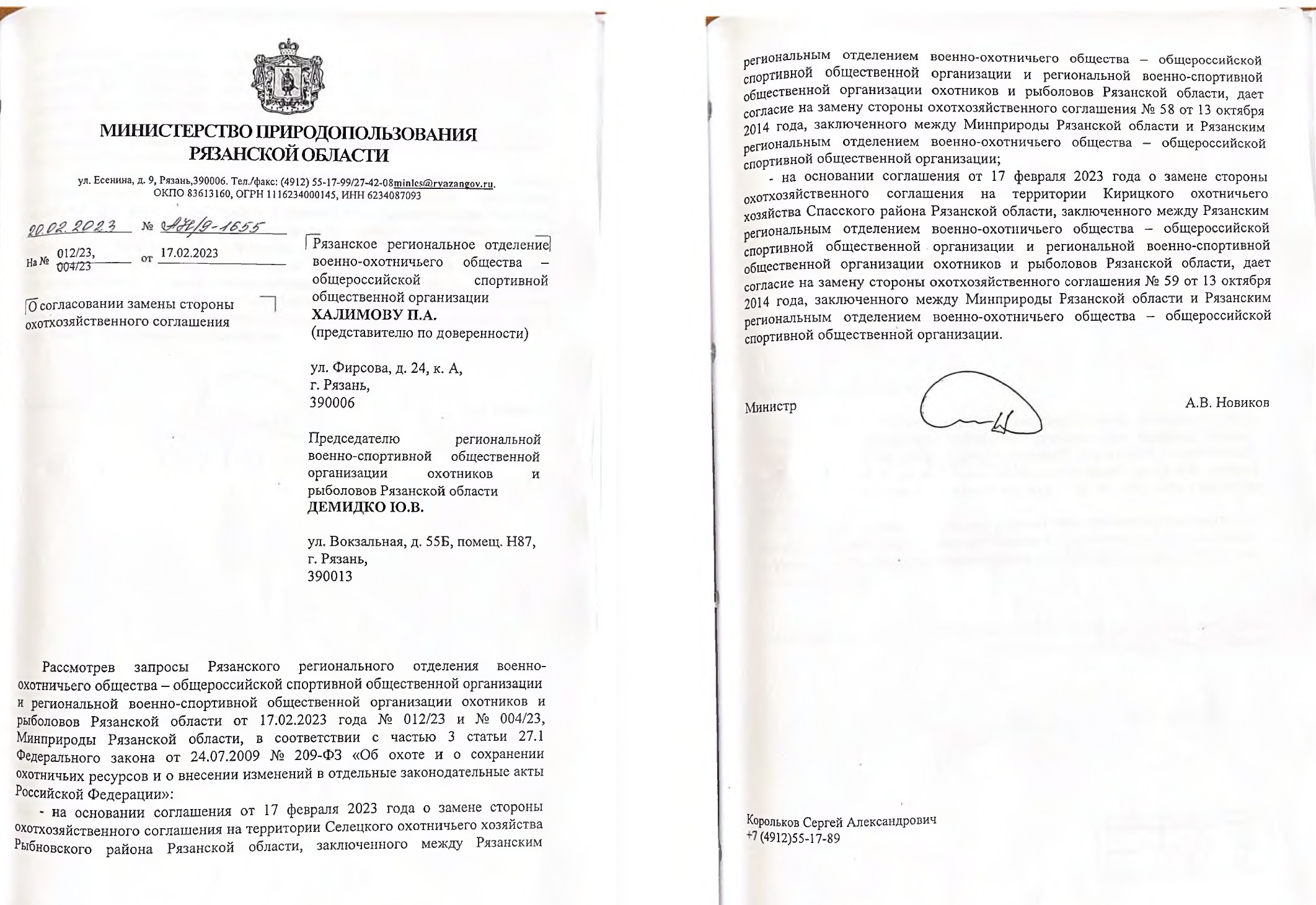 «Охотхозяйства перешли в пользование и управление вновь созданной некоммерческой организации, членами которой являются одни и те же охотники из Рязанской области. Между НКО заключили соглашение о сотрудничестве. Обе организации успешно работают, соблюдают условия охотхозяйственных соглашений, платят налоги, выплачивают заработную плату штатным сотрудникам… Претензий со стороны органов исполнительной власти нет. Обе организации проверялись управлением Министерства юстиции в 2023 году», — отметил Демидко.