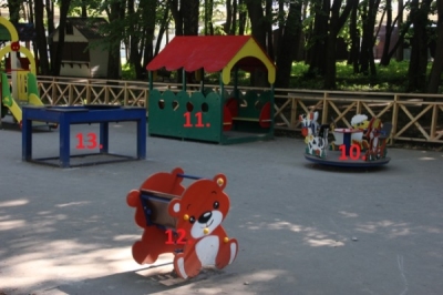 Трехместная карусель «Животные» (10), беседка (11), качалка на пружине «Мишка» (12), песочница (13). Да, это именно песочница. Судя по всему рабочие не смогли ее правильно установить, а точнее закопать на нужную глубину и теперь дети вынуждены играть с непонятной железякой.