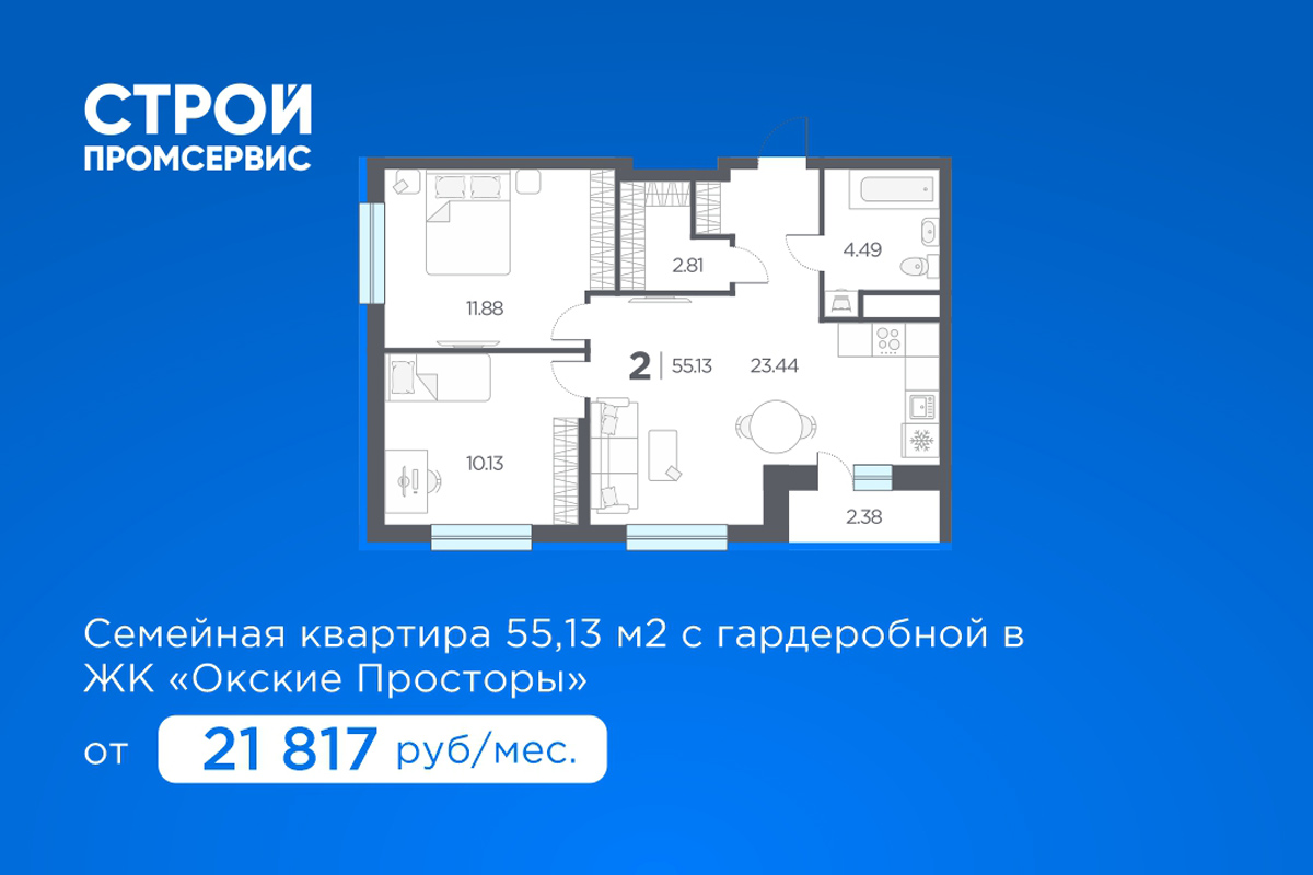 Со ставкой 4,1% семья без проблем сможет позволить себе любую подходящую квартиру. Например, семейная 2-комнатная планировка с большой кухней-гостиной и 2 изолированными спальнями в ЖК Окские просторы обойдется всего в 21 817 руб\мес.