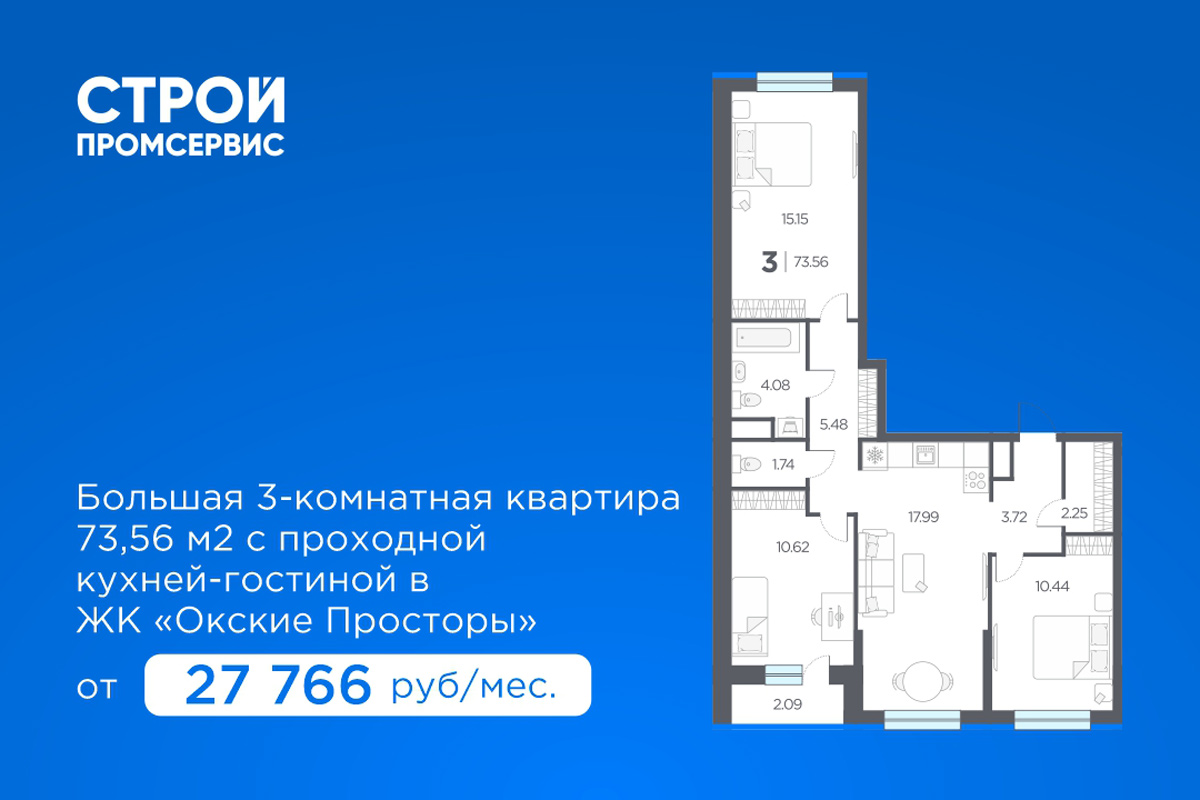 А большая 3-комнатная квартира для многодетной семьи с центрально-ориентированной кухней-гостиной обойдется всего в 27 766 руб\мес.