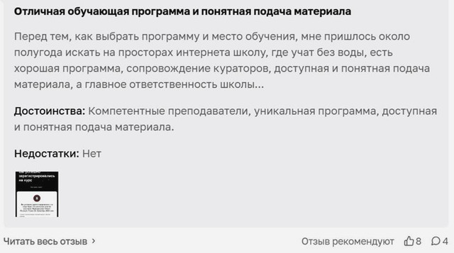 Многочисленные положительные отзывы, как и этот, упоминают налаженную систему поддержки во время учёбы. Кураторы не менее важные участники образовательного процесса. И в Академии взаимодействие между членами команды чётко налажено, что не может не радовать. Каждый ответственно выполняет свою работу: преподаватели помогают разобраться со сложным материалом, проверяют домашнюю работу на ошибки, а задача кураторов — сориентировать по организационным моментам, пройти весь путь от начала до конца обучения совместно с подопечным.