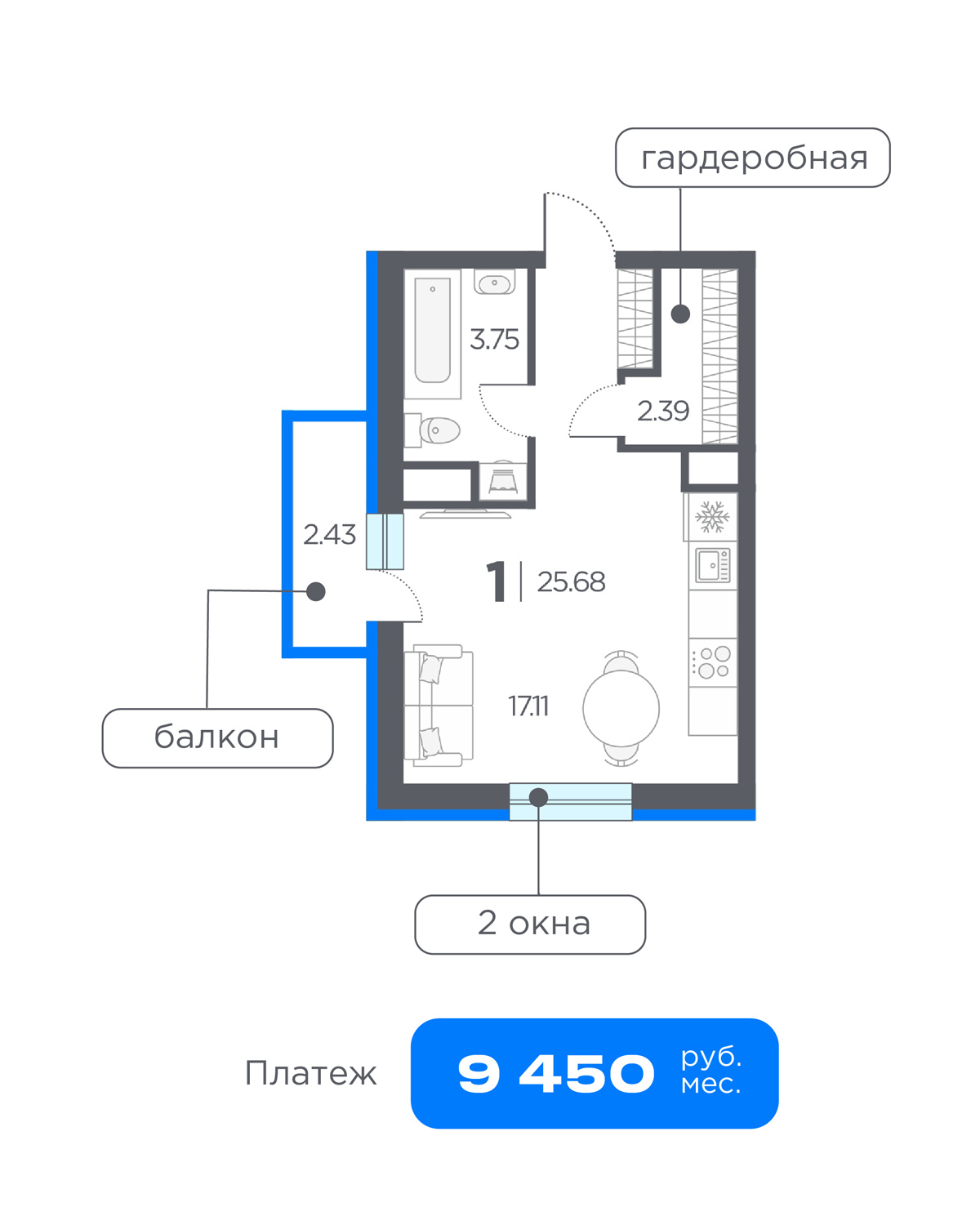 По действующим программам жильё можно купить со ставкой от 3,5% и ежемесячным платежом от 9 450 рублей. Например, уютную студию, где много естественного света и собственного пространства для жизни.