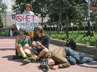 Участники пикета изображали людей, радующихся жизни на фоне картонного макета фенолформальдегидного цеха. Но когда было объявлено, что «цех» открывается, и из «трубы» повалил ядовитый дым, актеры вынуждены были надеть противогазы. Тут же выяснилось, что в противогазах нельзя пить кофе, петь под гитару, целоваться, нюхать цветы. А стоило участникам представления противогазы снять – для того, чтобы пить, петь, целоваться и принюхиваться, – как они «бездыханными» упали на асфальт. После чего оставшимися был развёрнут лозунг: «Люди важнее прибыли» и плакаты «Решать тебе – сопротивляйся» и «Нет фенолформальдегидному цеху». Пикетчики размахивали чёрно-зелёными флагами.