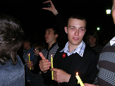 По традиции, участники «хода» со свечками и портретами Александра Попова три раза прошли вокруг памятника основателю радиосвязи и милиционеров (вторые дежурили у памятника и смотрели за порядком).