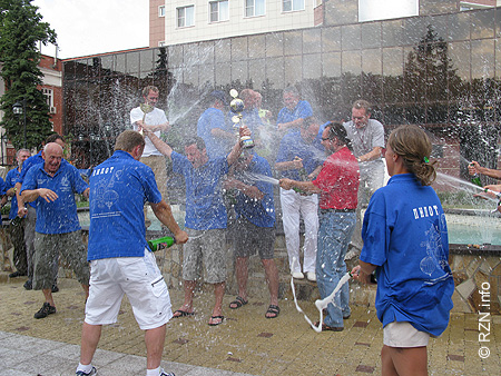 Напоследок все пилоты сфотографировались около фонтана, облили друг друга шампанским, а обладателя Кубка России по воздухоплавательному спорту Сергея Латыпова сбросили в фонтан. «Это будет новой традицией», – пояснил столь странный поступок Лев Маврин.