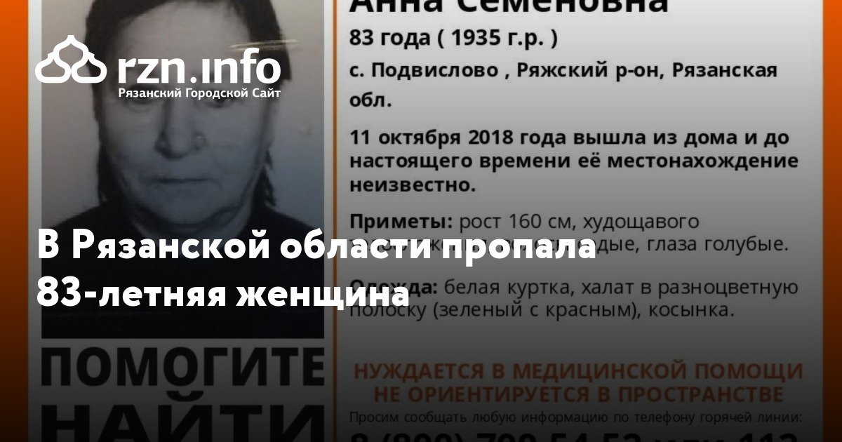 Анна Семеновна Анискина вышла из дома в селе Подвислово Ряжского района в четверг, 11 октября. До сих пор о ее местонахождении ничего неизвестно.