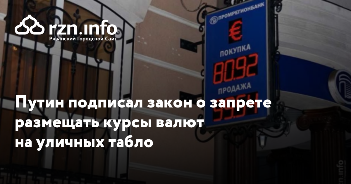 Владимир Путин подписал закон о запрете банкам размещать информацию о курсах валют на уличных табло. Документ опубликован на официальном правовой информации.