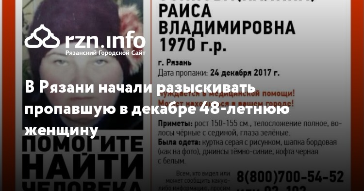 В Рязани начали разыскивать пропавшую в декабре 48-летнюю Раису Осипову (Калину). Об этом сообщила группа поисково-спасательного отряда «».