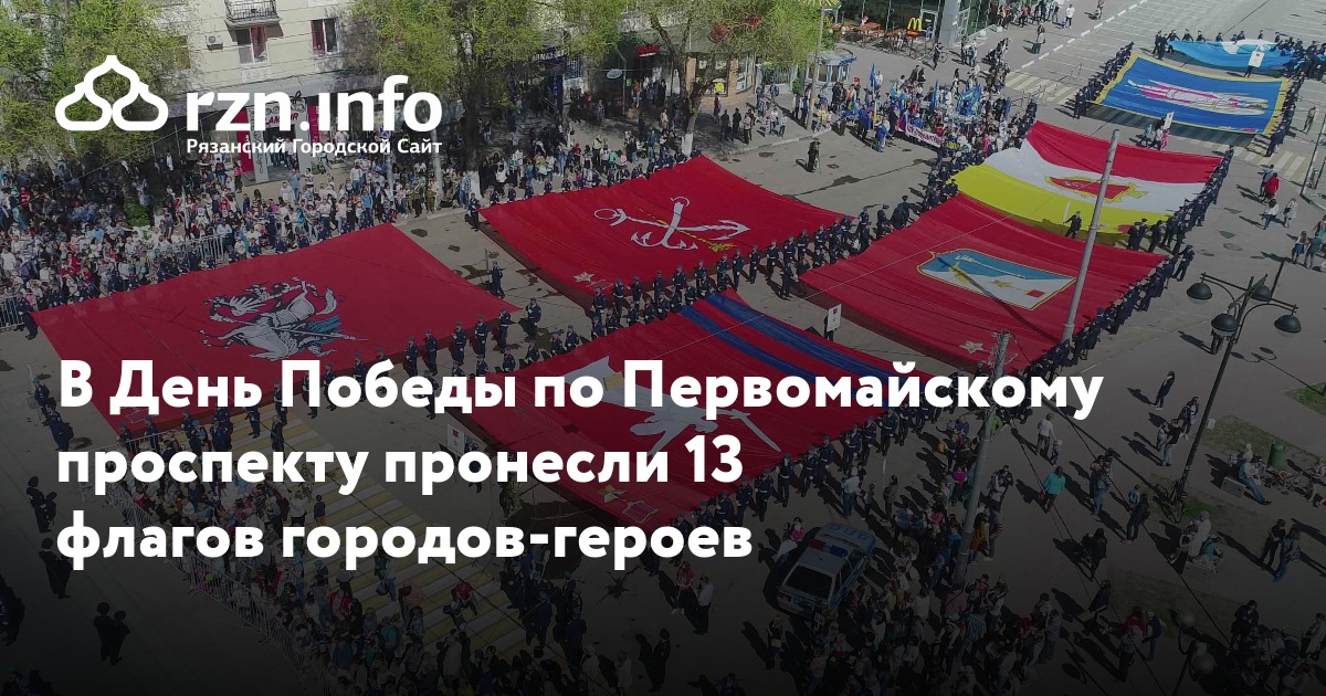 В среду, 9 мая, в Рязани прошел марафон флагов городов-героев. Во время парада по Первомайскому проспекту пронесли 13 огромных полотнищ размером 10 на 15 метров.