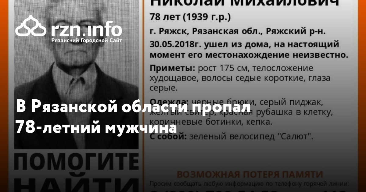 Одиноков Николай Михайлович 30 мая уехал на своем зеленом велосипеде «Салют» из своего дома в Ряжске, в настоящий момент его местонахождение неизвестно.