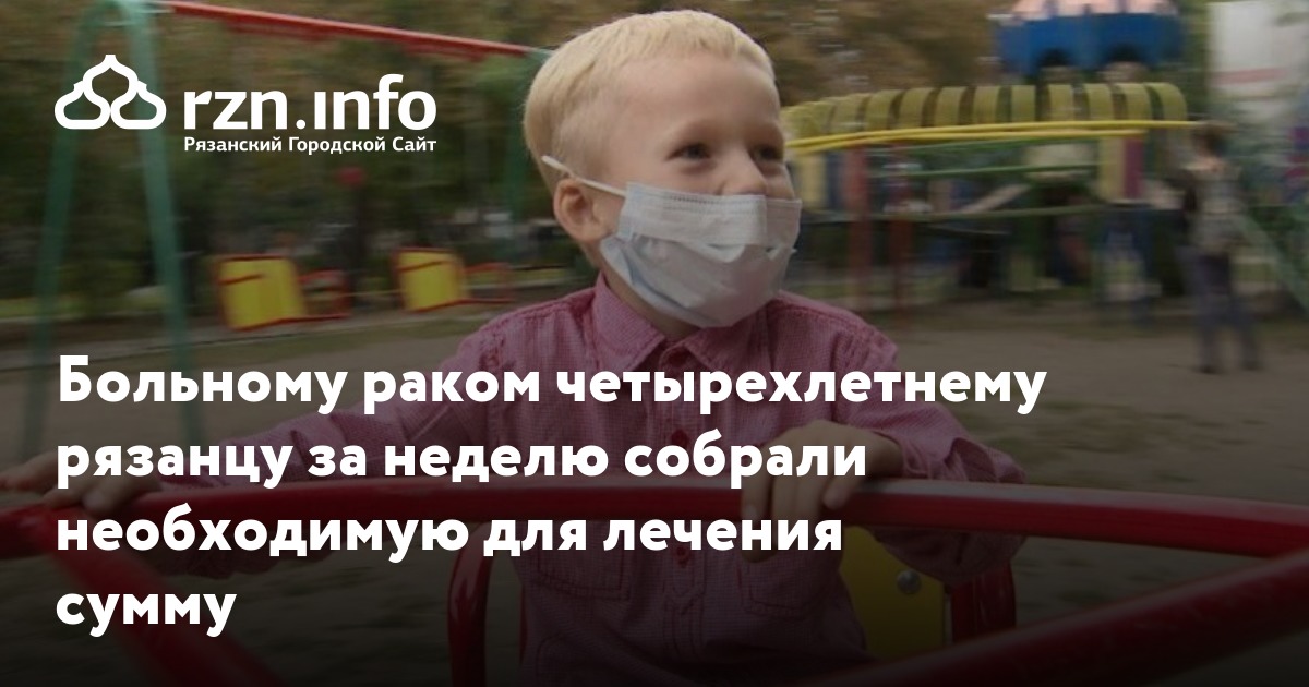 Больному раком четырехлетнему рязанцу за неделю собрали необходимую для лечения сумму. Об этом сообщил телеканал «».