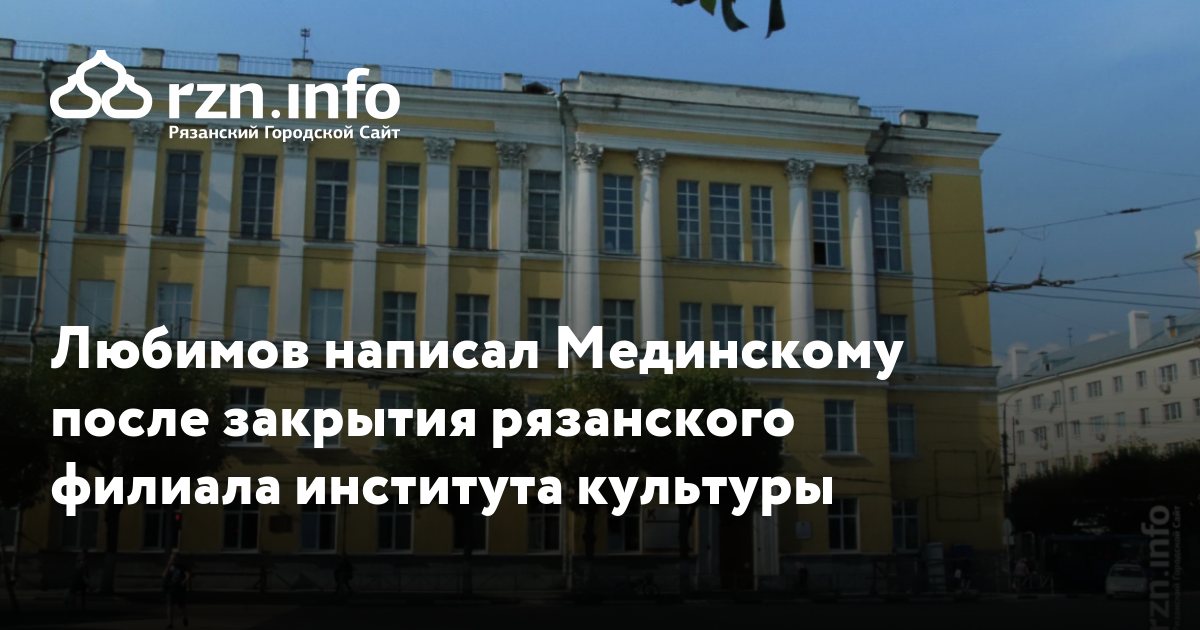 Николай Любимов написал Владимиру Мединскому после закрытия рязанского филиала института культуры. Губернатор предложил главе Минкульта согласовать открытие профильных направлений подготовки в местных вузах, в том числе Рязанском государственном университете имени Есенина, передает .