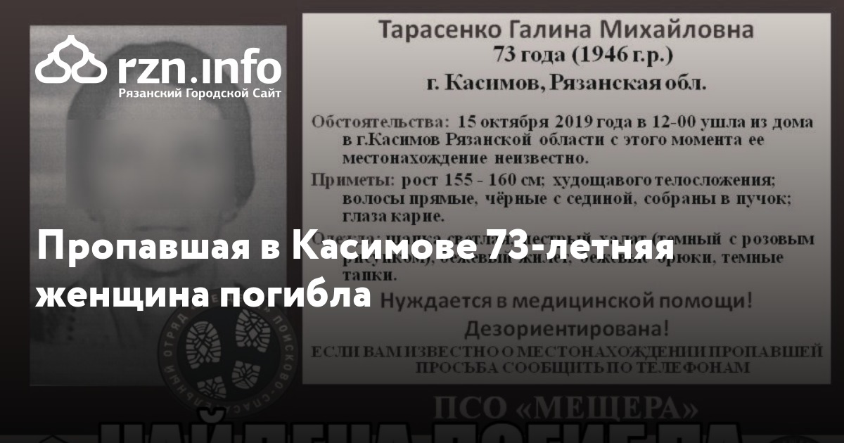 Пропавшая в Касимове 73-летняя женщина погибла. Об этом сообщили в поисково-спасательном отряде «Мещера».
