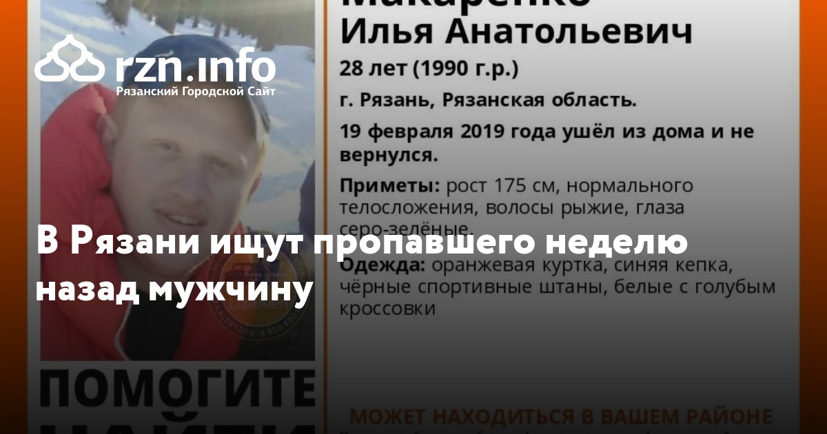 В Рязани и области ищут 28-летнего Илью Макаренко, который пропал 19 февраля. Об этом сообщили волонтеры поисково-спасательного отряда «Лиза Алерт».