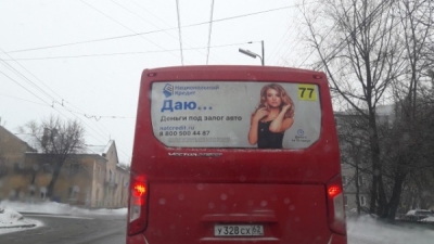 Также на заседании рассмотрели рекламу микрофинансовой организации «Национальный кредит», размещенной на маршрутках. Изображение с образом девушки гласит: «Даю… Деньги под залог авто».