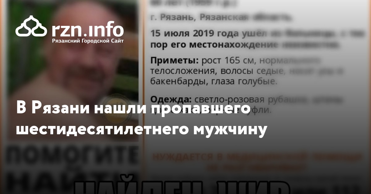 Ранее в регионе проходили поиски Тихонова Сергея Петровича, который ушел из больницы 15 июля. С тех пор никто не знал о его местонахождении. Мужчина 1959 года рождения проживает в Рязани.