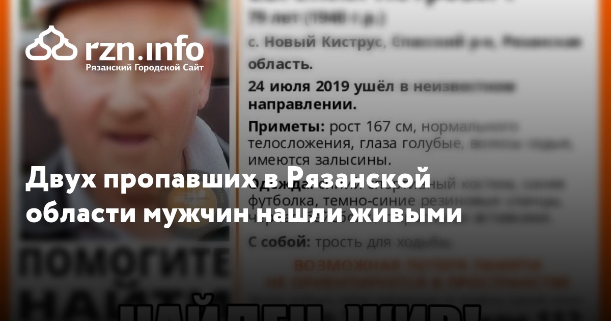 62-летнего Ивана Завьялова, пропавшего в Шиловском районе, и 79-летнего Евгения Дмитриева, пропавшего в Спасском районе, нашли живыми. Об этом сообщила группа поисково-спасательного отряда «Лиза Алерт Рязань».