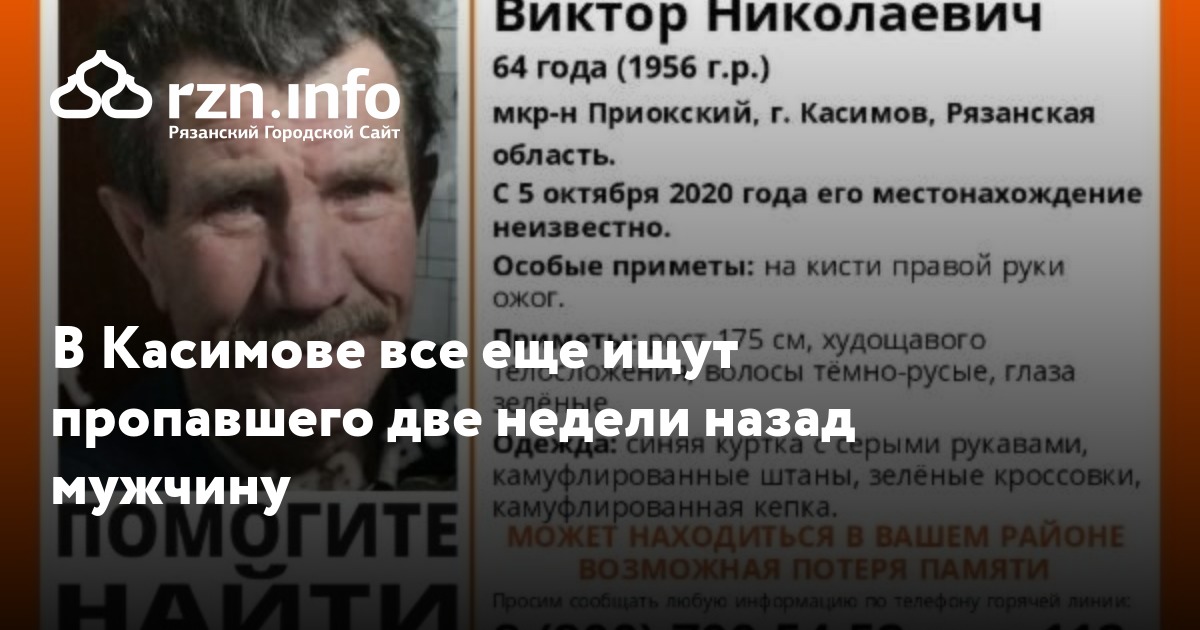В Касимове продолжают искать 64-летнего Виктора Николаевича Ларина, который пропал 5 октября. Об этом сообщили волонтеры «Лиза Алерт».