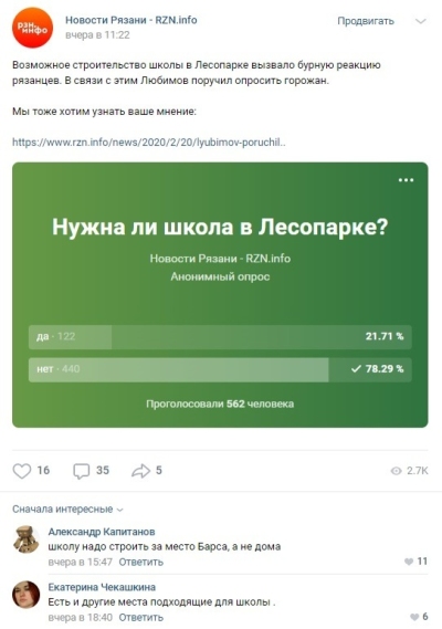 Аналогичные опросы в это же время проводит RZN.info и крупные городские паблики. Результаты этих голосований пока сильно отличаются от официального опроса: так, в группе RZN.info более 78% участников голосования выступили против школы в Лесопарке.