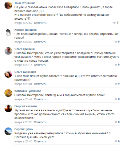 «Вчера около 22:30 ехала домой из центра. Как только машина оказалась на улице Тимуровцев, я почувствовала нестерпимый запах газа. От него першило в горле. Вышла из машины около дома — думала задохнусь. Пахло даже в квартире, сквозь закрытые окна, — написала в редакция горожанка. — Страшно, какие последствия подобные „газовые атаки“ могут иметь для здоровья».