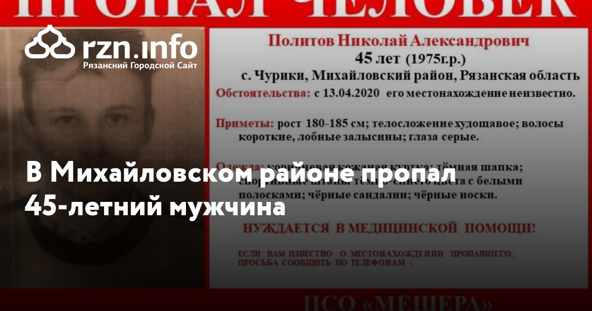 В селе Чурики Михайловского района Рязанской области пропал 45-летний Николай Политов. Об этом сообщил поисково-спасательный отряд «Мещера».