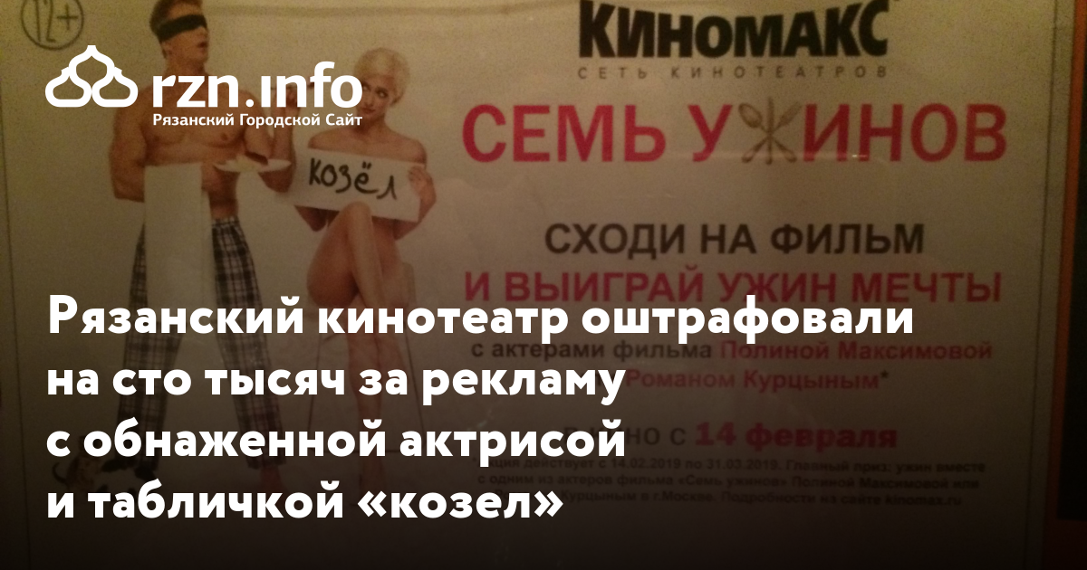 Рязанский кинотеатр «Киномакс» оштрафовали на сто тысяч за рекламу с обнаженной актрисой и табличкой «козел». Об этом сообщил сайт регионального УФАС.