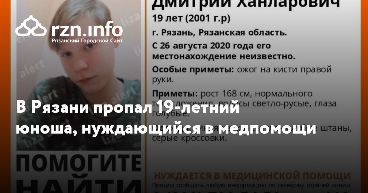 В Рязани пропал 19-летний Дмитрий Герега, который нуждается в медпомощи. Об этом сообщили в поисково-спасательном отряде «Лиза Алерт Рязанской области».