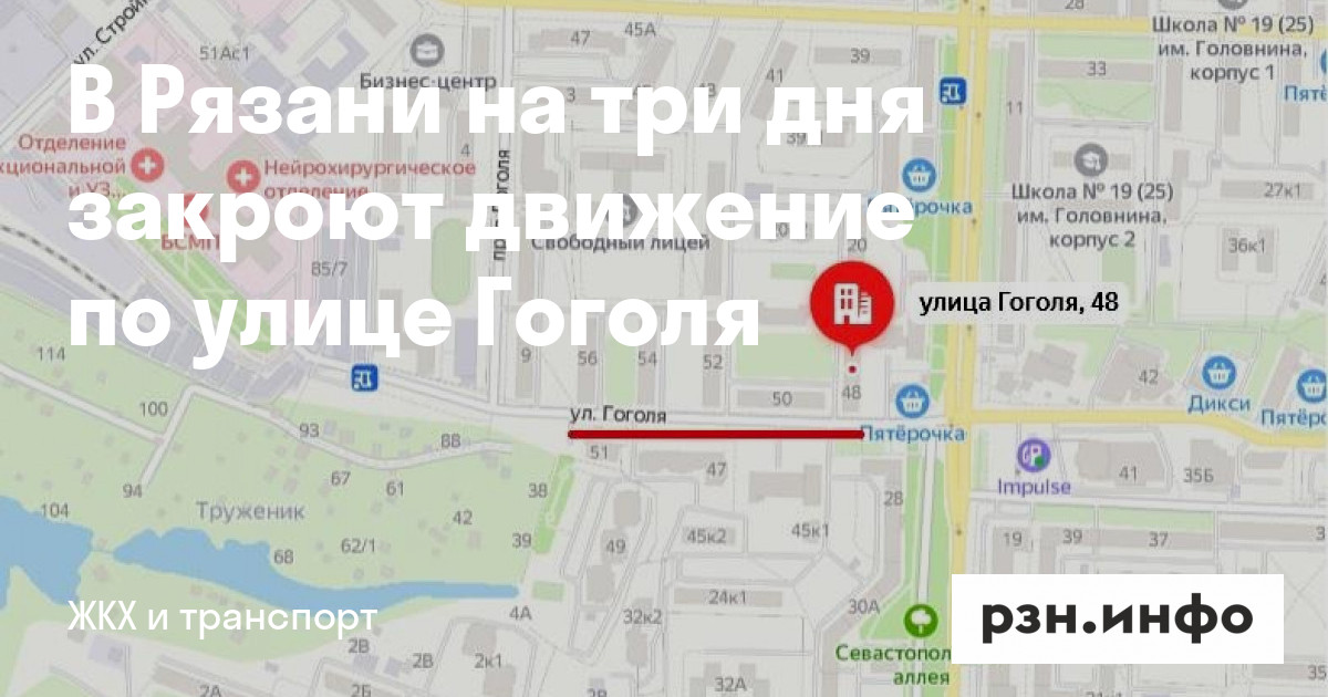 В Рязани на три дня закроют движение по улице Гоголя. Об этом во вторник, 19 октября, сообщила пресс-служба мэрии.