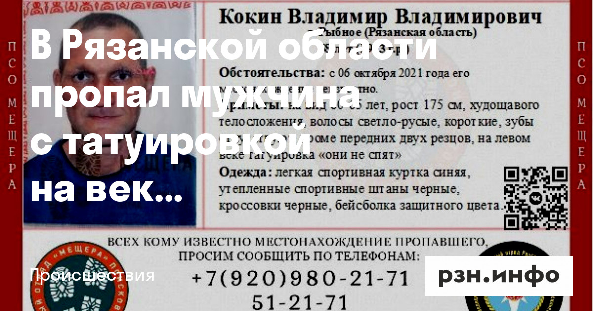 В Рязанской области пропал мужчина с татуировкой на веке