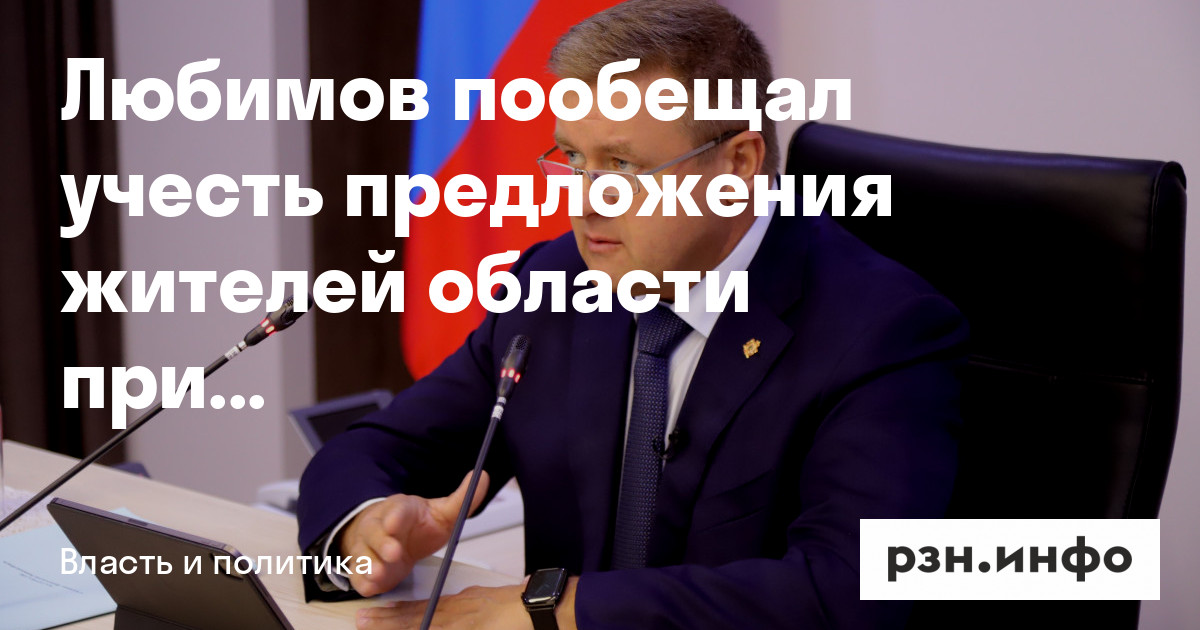 Любимов пообещал учесть предложения жителей области при формировании бюджета. Об этом губернатор Рязанской области Николай Любимов заявил в понедельник, 25 октября, после итогов собрания фракции «Единая Россия» Госдумы.