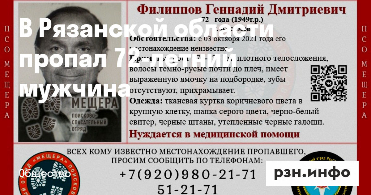 Филиппов Геннадий Дмитриевич 1949 года рождения пропал в Касимове 3 октября 2021 года.