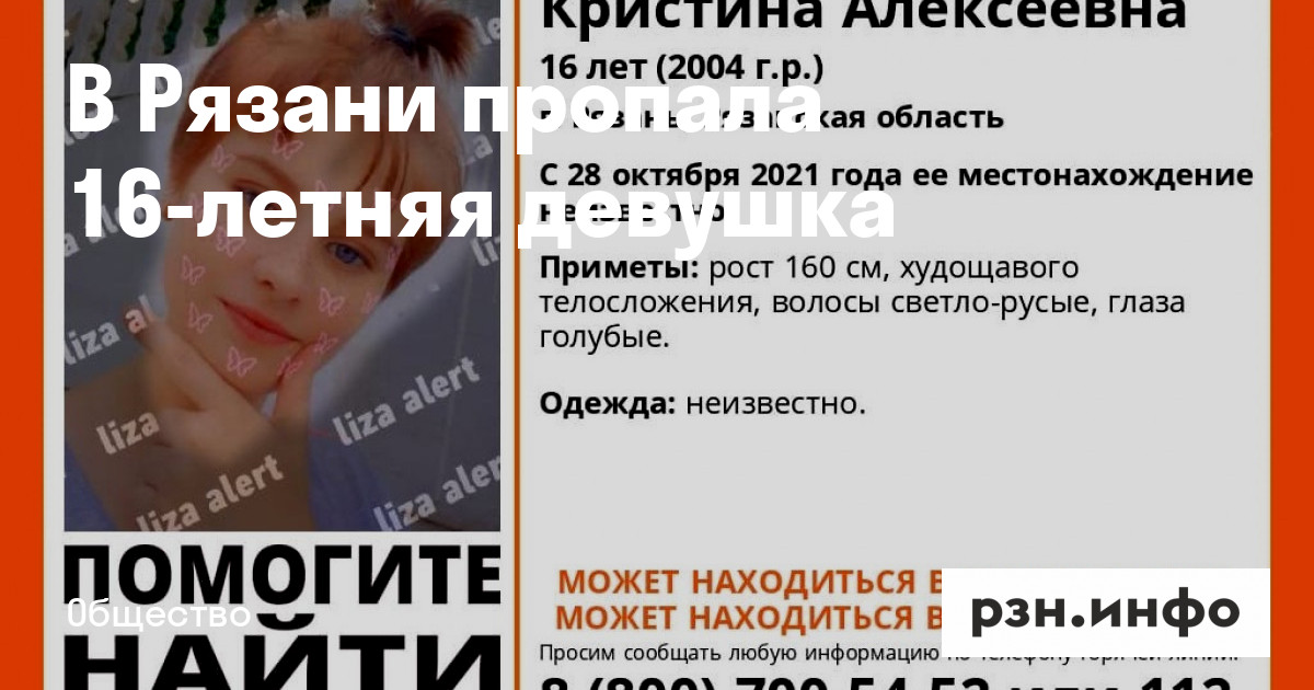 В Рязани ищут 16-летнюю Таланину Кристину Алексеевну. Об этом волонтеры поисково-спасательного отряда «ЛизаАлерт».