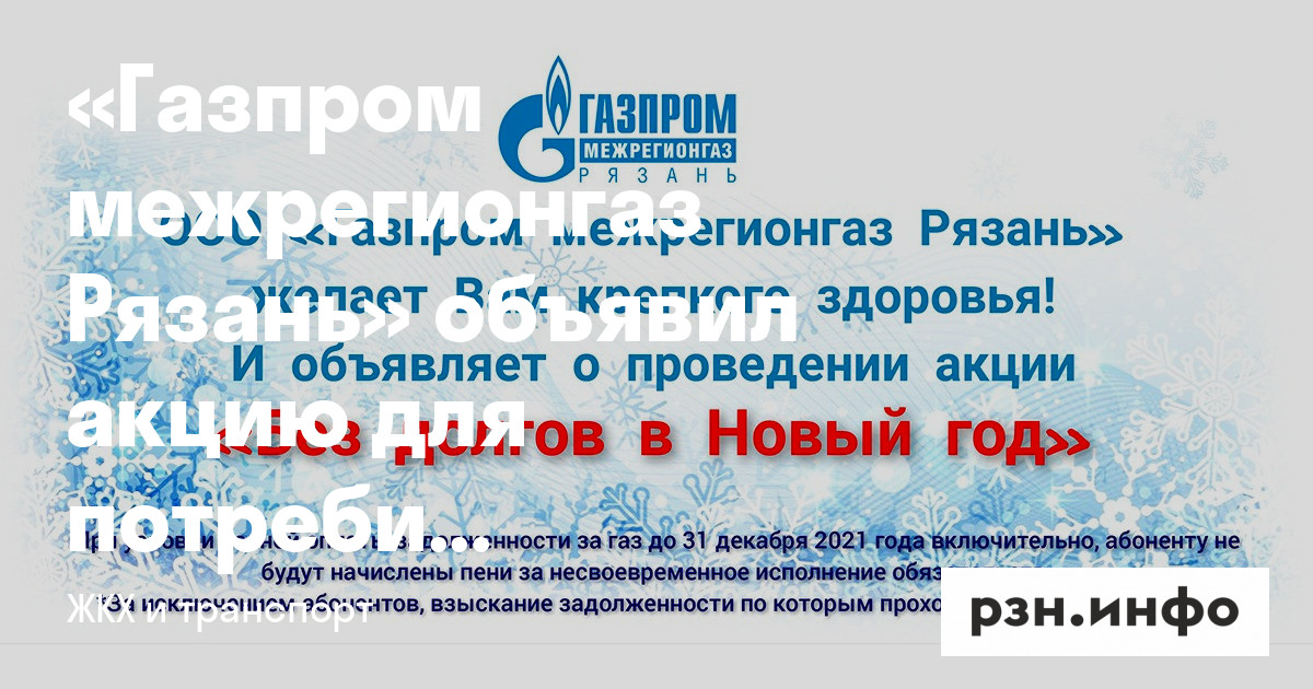 «Газпром межрегионгаз Рязань» объявил о старте акции «Без долгов в Новый год» среди абонентов региона, которая направлена на улучшение платежной дисциплины. В рамках акции задолженности по пени в полном объеме спишут потребителям, которые погасили просроченную задолженность и текущее потребление газа до 31 декабря 2021 года включительно.