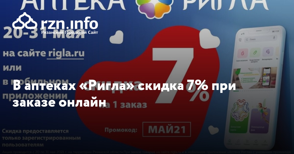 Акция проводится с 20 по 31 мая 2021 г. на территории Рязанской области. При заказе товаров на сайте и в мобильном приложении «Аптека Ригла» с указанием промокода «МАЙ21», предоставляется скидка до 7% на весь ассортимент, кроме товаров Аллокин-Альфа лиоф. д/р-ра для п/к введ. 1 мг №3, Аллокин-Альфа лиоф. д/р-ра для п/к введ. 1 мг №6, Аллокин-альфа пор. д/ин. 1 мг №3, приборов Елатомского приборного завода, Арепливир таб. п/о плен. 200 мг №40, Оптинол Глубокое увлажнение 0,4% 10мл, Оптинол Мягкое восстановление 10мл, Оптинол Экспресс увлажнение 0,21% 10мл, Ригла маска медицинская трехслойная одноразовая №5, Ферстэйд маска медицинская №5, а также товаров по акциям «Товар дня», «Стоп цена» и товаров по специальному предложению.