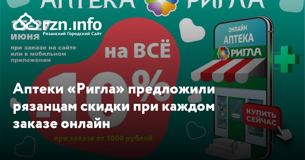 С 15 по 27 июня в аптеках «Ригла» при онлайн заказе на сумму от 1 000 рублей действует скидка в 10%.