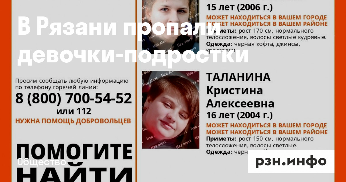 В Рязани ищут 15-летнюю Ульяну Фокину и 16-летнюю Кристину Таланину. Об этом в группе поисково-спасательного отряда «ЛизаАлерт Рязанской области».